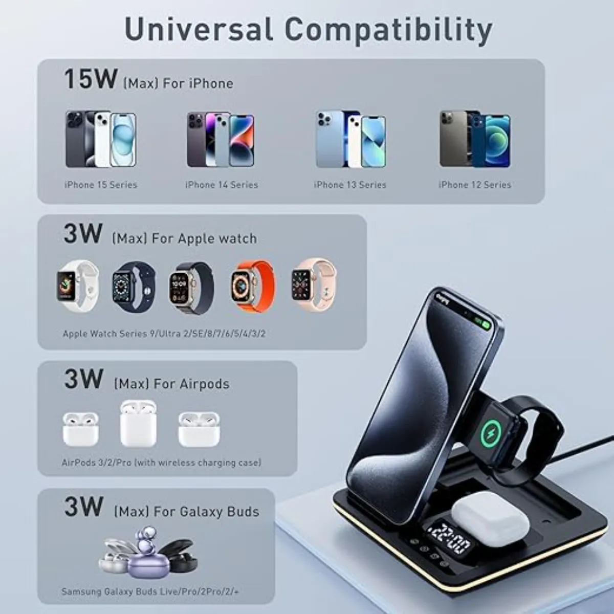 👍👍👍👍5 IN 1 WIRELESS CHARGER: This comprehensive 5-in-1 wireless charging solution consolidates three distinct charging modules—suitable for a phone, headset, and watch—alongside an alarm clock and LED light. It supports up to 15W of power for cell phone charging, 5W for AirPods, and 3W for iWatch, offering a convenient and efficient charging solution for multiple devices. This design significantly reduces clutter on your home nightstand, office desk, or in a meeting room.