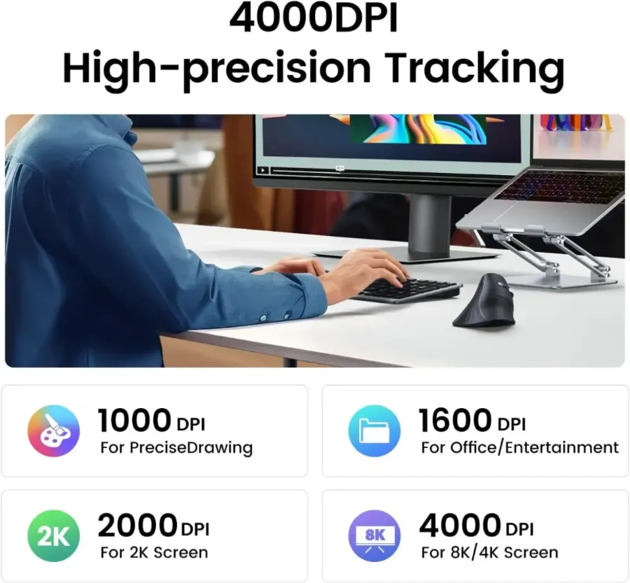 DPI بالا و سطوح قابل تنظیم: این ماوس ارگونومیک محدوده DPI بالایی را با چهار سطح قابل تنظیم ارائه می‌دهد: ۱۰۰۰، ۱۶۰۰، ۲۰۰۰ و ۴۰۰۰. این دقت و کنترل فوق‌العاده‌ای را برای برنامه‌های دسکتاپ و بازی فراهم می‌کند. * سازگاری و انعطاف‌پذیری: ماوس عمودی UGREEN با در نظر گرفتن سازگاری گسترده طراحی شده است. این ماوس به طور یکپارچه با سیستم‌های مک و ویندوز و همچنین سیستم عامل‌ها و دستگاه‌های مختلف کار می‌کند